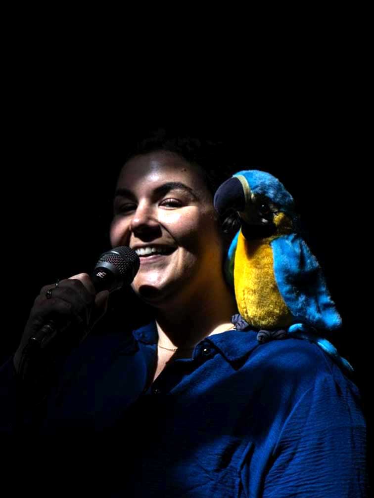 Jojo n’est pas qu’une voix, c’est aussi la bonne humeur du groupe, la MC’ chaleureuse que l’on remercie d’être chanteuse. Si les poulaillers ont des coqs pour les réveiller, les perroquets ont leur perrockeuse !